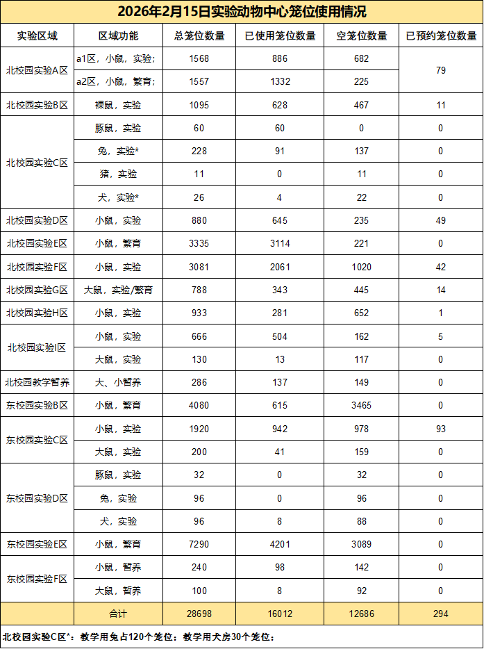 导航痕迹 中山大学实验动物中心 新闻公告 通知公告 2026年2月15日-实验动物中心笼位使用情况 扫描此二维码分享 2026年2月15日-实验动物中心笼位使用情况 发布人:曾嘉城 发布日期:2026-02-15