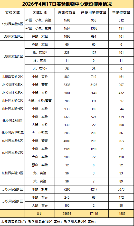 导航痕迹 中山大学实验动物中心 新闻公告 通知公告 2026年4月17日-实验动物中心笼位使用情况 扫描此二维码分享 2026年4月17日-实验动物中心笼位使用情况 发布人:曾嘉城 发布日期:2026-04-17